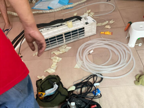 (4)包扎連接管線:按電源線、信號線在上側,連接管在中間,水管在下側的順序進行包扎。包扎時不要用力拉動蛇形管。確定好出水位置連接排水管,當排水管不夠長,需加長排水管時,應注意排水管加長部分應用護管包住其室內部分;排水管接口要用膠密封,水管在任何位置不得有盤曲;伸展管道時,可用乙烯膠帶固定5-6個部位。橫向抽出管道的情況下,應覆蓋絕熱材料。包扎時應避開連管接頭以備檢漏。