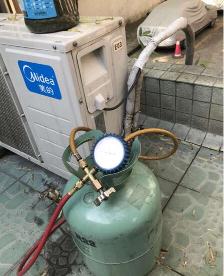 夏季一般充氟壓力表顯示一般為0.45MPA到0.55MPA之間。啟動(dòng)壓縮機(jī),利用鋼瓶與制冷系統(tǒng)壓力差補(bǔ)充制冷劑。