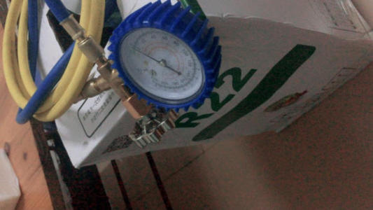 2、找到外機,用活動扳手打開外機的檢修供口,接上壓力表,看看壓力是否正常,正常壓力是0.4到0.5MPa,(表針指倒圖中紅圈圈住的地方)低于這個數(shù)值就表示需要加氨,那么我們就開始給空調加入氨吧!找到空調外機的機箱上的銘牌,找到制冷劑需要什么樣的型號。